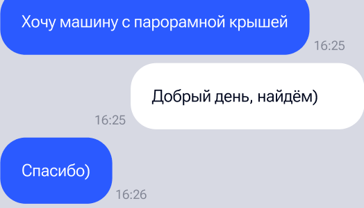 Всегда на связи, быстро отвечаем и оперативно решаем вопросы. Круглосуточно подбираем авто с учетом всех пожеланий клиента